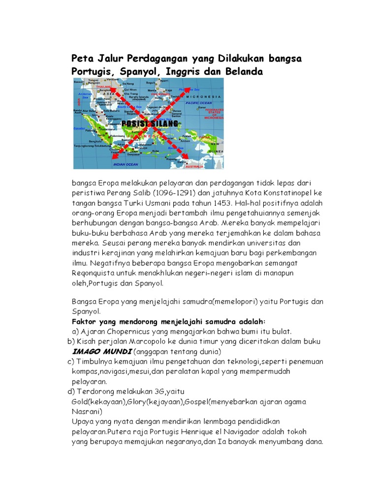 Jadi gini cerita awal mulanya, jauh sebelum bangsa eropa melakukan penjelajahan ke wilayah asia, mereka udah bisa menikmati kekayaan alam dari wilayah. Ia dianggap sebagai penemu benua amerika karena memberi petunjuk jalan bagi bangsabangsa eropa ke benua itu. Melakukan penjelajahan untuk mencari jalur perdagangan baru. Aktivitas perdagangan bangsa eropa di laut tengah ditutup d. Latar belakang kedatangan bangsa eropa ke indonesia.